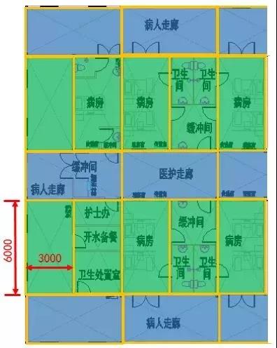此次武汉火神山医院、雷神山医院的建造时间短、任务重,采用了模块化建筑的形式。火神山医院的局部平面图,可以看出,整个建筑是由若干个6m*3m的模块,通过水平与垂直方向不同的组合方式,形成了病房、卫生间、缓冲间、病人走廊、医护走廊等等不同的功能分区,基本解决了传染病医院的流线及分区问题。