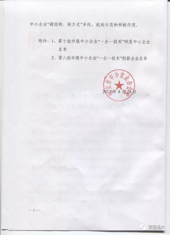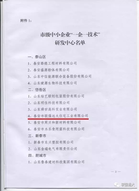经各县市区推荐,专家委员会严格评审,泰安市中小企业办公室研究决定,认定泰安联强远大建筑工业科技有限公司的研发中心为市级中小企业“一企一技术”研发中心。