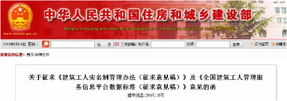 为贯彻落实《国务院办公厅关于促进建筑业持续健康发展的意见》(国办发〔2017〕19号)文件精神,改革建筑劳务用工制度,开展建筑工人实名制管理,做好全国建筑工人管理服务信息平台建设工作,我司组织起草了《建筑工人实名制管理办法(征求意见稿)》及《全国建筑工人管理服务信息平台数据标准(征求意见稿)》。现印送你单位,请认真研究并提出意见,于2018年6月11日前将书面意见及电子版反馈我司施工监管处。